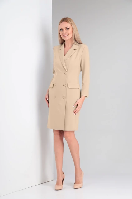Элегантное платье с двухбортной застежкой . По переду карманы в рельефных швах. Рукав втачной, двухшовный, длиной 7/8. Длина платья по спинке - 95 см. Длина рукава - 55 см.