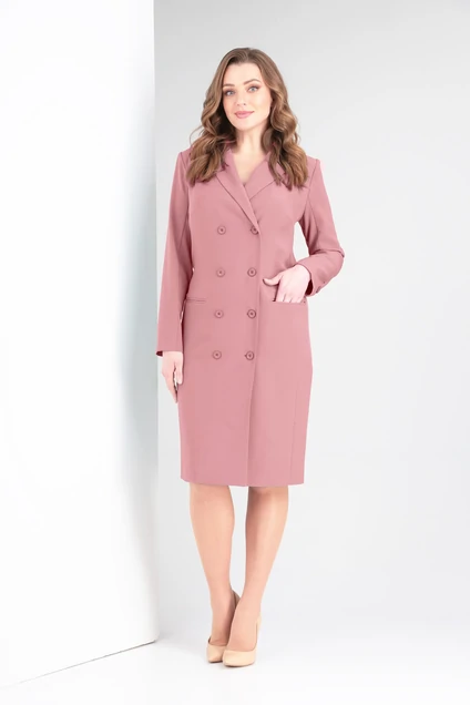 Платье женское полуприлегающего силуэта с двубортной застёжкой на петли пуговицы. Перед с нагрудными вытачками, наклонными в рельефным швам от пройм до низа, с прорезными карманами "в рамку". Спинка со средним швом и рельефными швами от пройм до низа. Рукав втачной двухшовный, длинный. Воротник пиджачного типа. Длина платья по спинке - 104 см. Длина рукава - 61 см.