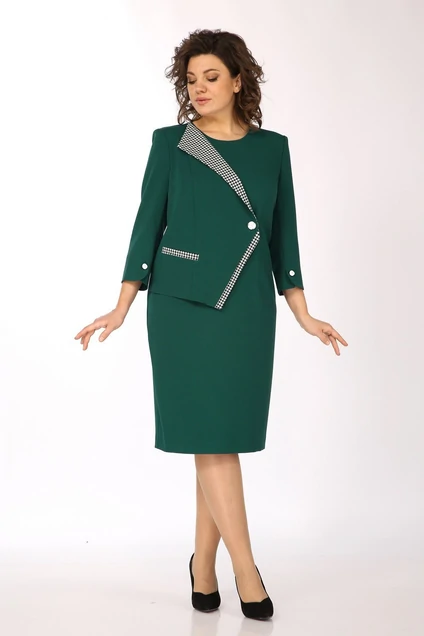 Платье женское полуприлегающего силуэта с застёжкой на потайную тесьму "молнию" в среднем шве спинки заканчивающимся шлицей. Перед с талиевыми и нагрудными вытачками, с правой стороны отделочная деталь застёгивается на функциональную петлю и пуговицу. Рукав втачной, двухшовный, длиной 3/4 с открытой шлицей в передних швах. Горловина круглая, углублена, обработана обтачкой. Длина платья по спинке - 107 см. Длина рукава - 49 см.