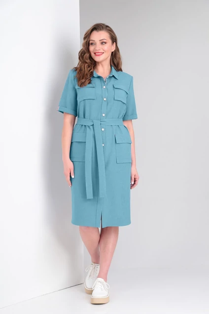 Платье женское полуприлегающего силуэта с центральной застёжкой на петли, пуговицы на отрезной планке, воротник рубашечного типа с отрезной стойкой. Перед с нагрудными вытачками с накладными карманами с клапанами. Спинка со средним швом и притачной патой по линии талии. Рукав втачной, одношовный, короткий с цельнокроенной манжетой по низу. На участках по низу рукавов и левому краю борта декоративная тесьма. Платье укомплектовано поясом-завязкой. Низ платья по боковым швам фигурной формы. Длина платья по спинке - 104 см. Длина рукава - 27,5 см.