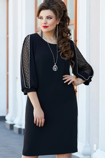 Эффектное платье в лучших традициях элегантных нарядов от VITTORIA QUEEN. Превосходный чёрный и яркие акценты создают дорогой образ. Платье полуприлегающего силуэта, по переду расположены нагрудные вытачки, вырез горловины округлой формы. По спинке расположена V- образная вставка из отделочной сетки, средний шов со шлицей, талиевые вытачки. Рукав втачной, двуслойный, нижний слой выполнен из отделочной сетки, в верхнем- обработаны разрезы декоративной тесьмой с бусинами, по низу рукава выполнена притачная манжета. Длина рукава 50 см (р-р 48-52), 51 см (р-р 54-58). Длина платья 103 см (р-р 48), 105 см (р-р 50), 107 см (р-р 52), 108 см (р-р 54), 110 см (р-р 56), 112 см (р-р 58).