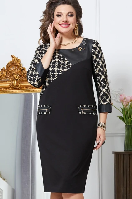 Состав: отделочная 62% ПАН, 32% полиэстер, 6% вискоза. Элегантное и изящное платье с элементами стиля «Шанель», выполнено в красивом сочетании черной и бежевой клетки, а также вставок из эко-кожи, придающих изделию благородный шик. В нем Вы будете великолепны как на любом торжестве, так и в повседневной жизни. Основная ткань - приятный к телу трикотаж черного цвета. Платье стройнит и идеально садится на любую фигуру. Горловина округлой формы. В качестве отделки пришиты декоративные украшения. По переду платья две декоративные рамки из кожи с бахромой и отделочной тесьмой-молнией под золото, имитирующие карман. По спинке горизонтальная кокетка с бахромой. Средний шов для удобства движения заканчивается шлицей. Рукав втачной, двухшовный, верхняя часть рукава из отделочной ткани в клетку, нижняя часть рукава основная ткань. Рукав заканчивается манжетой из эко-кожи. Платье на подкладке. Длина платья от высшей точки плечевого шва до низа 108 см (р.52-56), 112 см (р.58-62). Длина рукава 48 см.