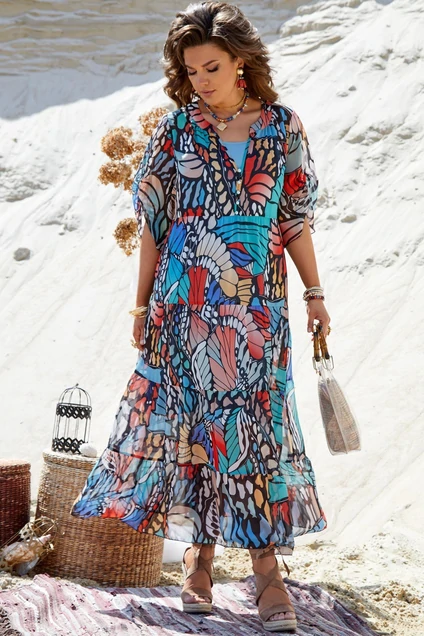 Яркий, невесомый комплект с сочным дизайнерским принтом, никогда не теряющим свою актуальность. Идеально подойдёт на жаркую летнюю погоду как для повседневной носки, так и для непринужденных прогулок и летних торжеств. Тонкая ткань с летящим силуэтом, который всегда актуален и универсален. Верхнее платье «в пол» трапециевидного силуэта с подрезом под грудью и воланами со сборкой. Горловина в платье с прилегающей стойкой, V-образный вырез по лифу украшен пуговицами-жемчужинами. Спинка без особенностей. Рукав втачной, удлинённый, расширяющийся к низу и со сборкой на венгерку по переду. Нижнее платье комбинация прямого силуэта на регулируемых бретелях. В боковых швах платья есть пояс для более удобного прилегания изделия. Длина верхнего платья от высшей точки плечевого шва до низа 136 см (р.52-56), 134 см (р.58-62). Длина рукава 36 см. Длина нижнего платья по боковому шву 78 см (р.52-56), 80 см (р.58-62).