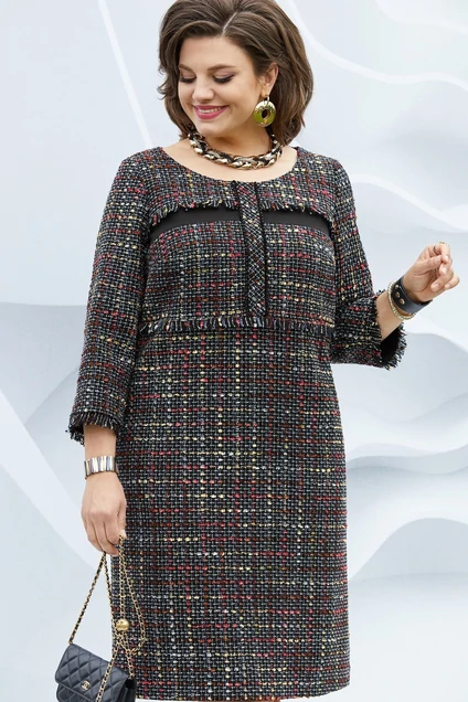 Состав: подкладка 100% полиэстер. Элегантное платье с элементами в стиле «Шанель» с изящным сочетанием отделочной ткани, придающими акцент изделию. Платье прямого силуэта, свободное с горловиной округлой формы. По переду платья имитация планки с отделкой декоративной тесьмой; кокетки со вставками бахромы в подрезах, а также вставки из отделочной ткани. По переду платья, ниже уровня груди подрез со вставкой бахромы. Спинка в платье без особенностей. Рукав втачной длинной 7/8 с отделкой в виде бахромы по низу. Платье без застёжки. Длина платья от высшей точки плечевого шва до низа 104 см (р.50-54), 107,5 см (р.56-60) см. Длина рукава 48 см.