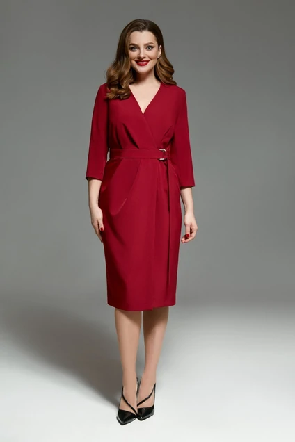 Платье женское из плательного материала. Полуприлегающего силуэта, с запахом. Платье с втачным рукавом, длиной 3\4. V-образная горловина, созданная за счёт запаха, эффектно подчёркивает шею и слегка удлиняет её. Платье разрезное по линии талии. Юбка с направленными складками. Крой платья визуально пересекает женскую фигуру по диагонали, а края запаха скрепляются на боку в области талии мягким поясом.