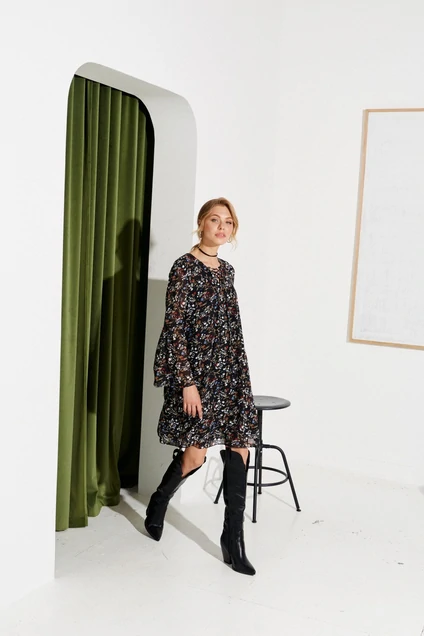 Платье женское, расширенное к низу. Выполнено из принтованного шифона, изделие на подкладке. Горловина V-образной формы, с отделкой в виде шнура, который вставлен в навесные петли пуговицы. Рукав втачной, разрезной. Нижняя часть рукава со сборкой в линии стачивания, расширенное к низу. миди