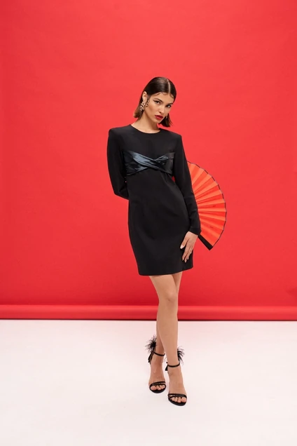 Платье женское, прилегающего силуэта. Выполнено из высококачественной трикотажной ткани. Горловина округлой формы. Рукав втачной, длинный. По переду притачивается отделочный элемент, в виде лифа с перекрутом из эластичной ткани с блеском. Спинка с средним швом, в который втачена потайная тесьма молния.