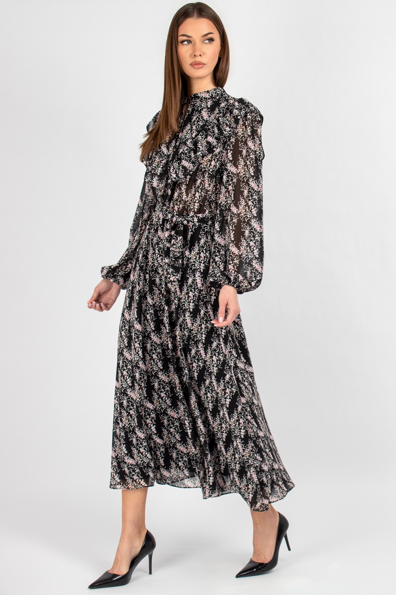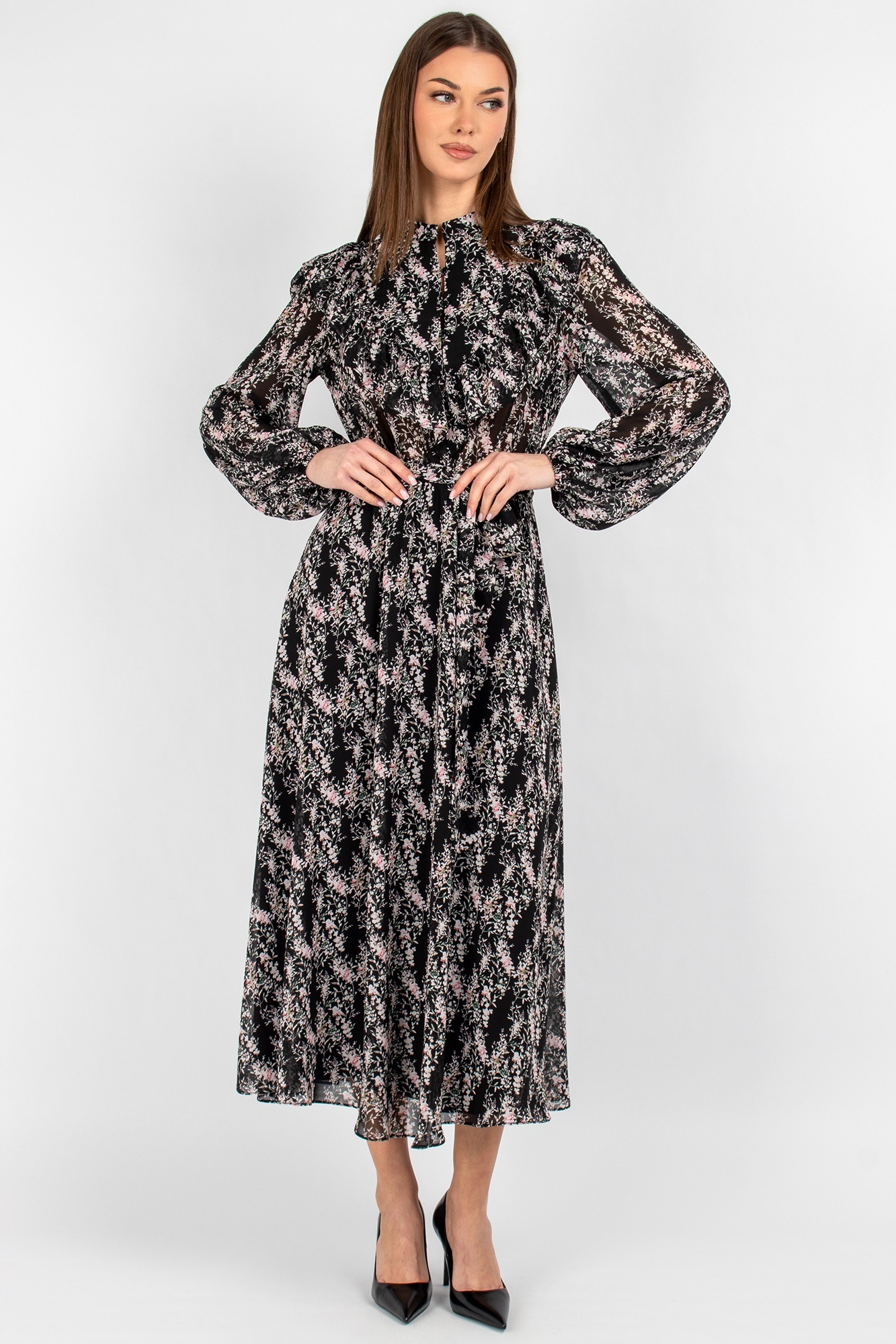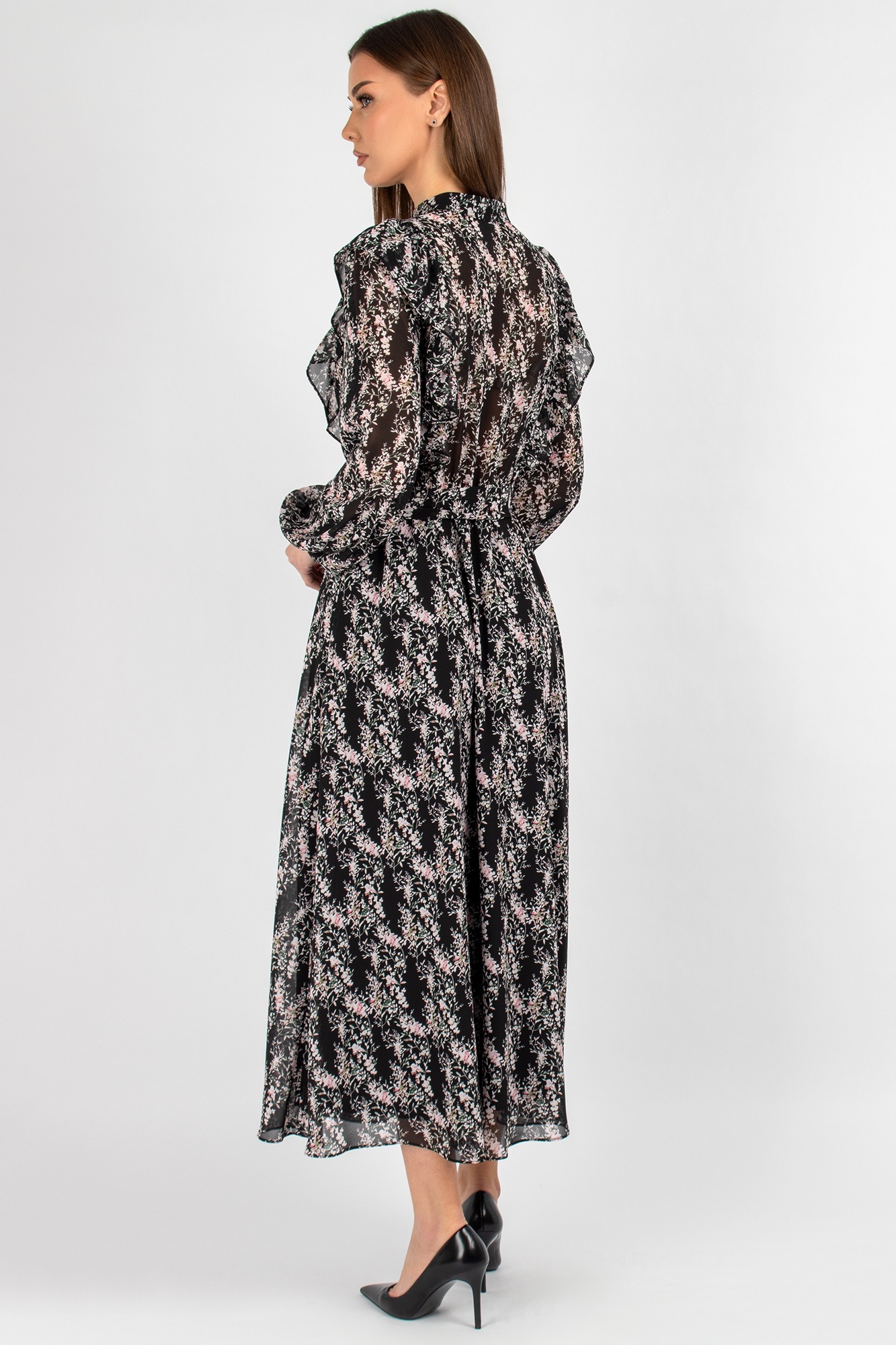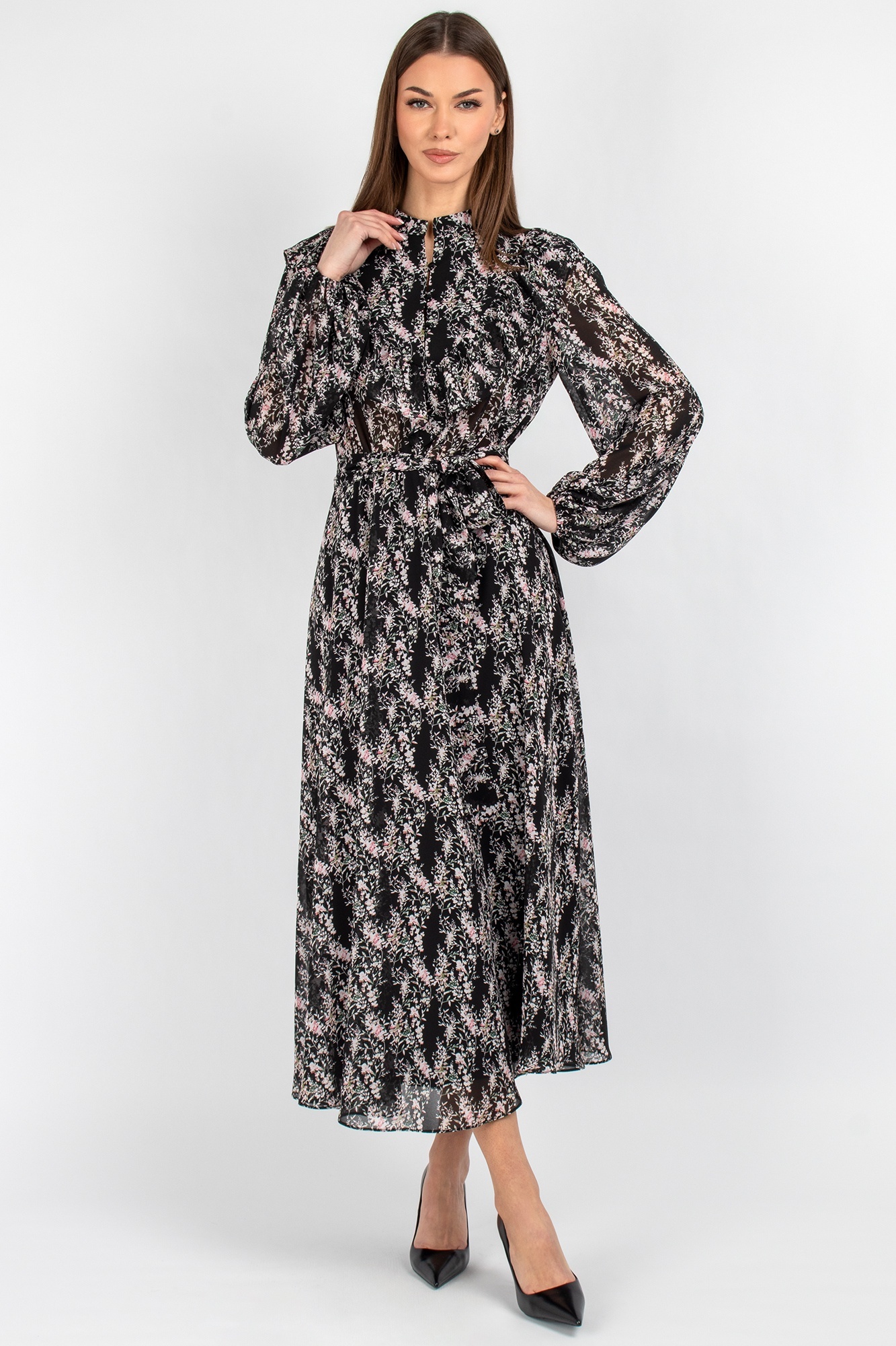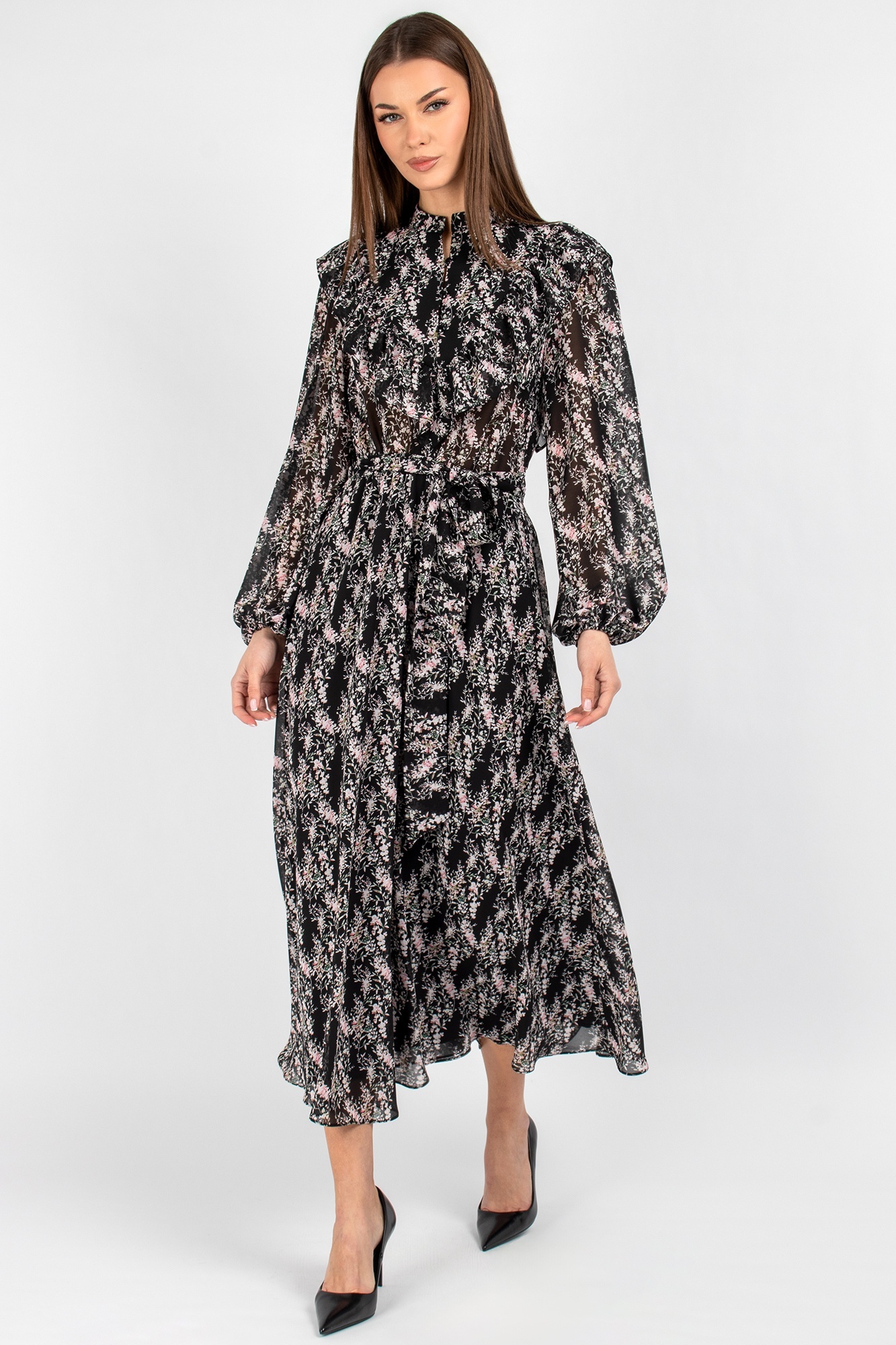 Платье 833 цветы VIZAVI TEKSTIL – это воплощение утончённой женственности и стиля. Коллекция бренда VIZAVI TEKSTIL предлагает это легкое шифоновое платье, которое идеально подходит для весенне-летнего сезона. Миди-длина и цветочный принт делают его универсальным для романтических встреч и деловых мероприятий. Полуприлегающий фасон с воротником-стойкой и завязывающимся поясом создаёт грациозный силуэт. Втачные рукава с эластичными манжетами добавляют комфорта и лёгкости движениям. Шифон придаёт воздушность и свободу движений, а застёжка на три пуговицы добавляет практичности. Идеально для создания романтичных и деловых образов.