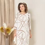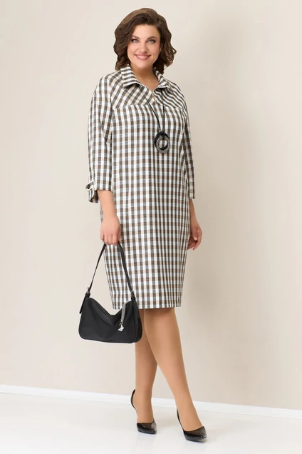 Платье из текстиля на основе хлопка с карманами и рубашечным воротником. Силуэт платья прямой, рукав втачной, спущенный. Длина рукава 48см. Длина платья по центру спинки 101 см. Украшение- подвеска в комплекте изделия.