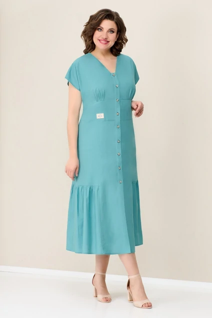 Изящное платье из ткани на основе льна с застежкой на пуговицы и коротким спущенным рукавом. По низу платья отрезной волан. Длина платья по центру спинки- 120см.