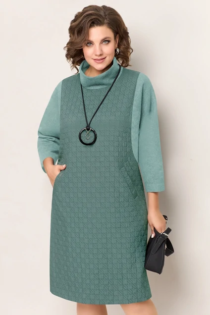 Комбинированное платье из стеганого текстиля и фактурного трикотажа с горловиной мягкая стойка. Силуэт платья - легкая трапеция, полуприлегающий. Рукав 7/8. Длина платья- 102 см по центру спинки. Украшение в виде оригинальной подвески в комплекте изделия.