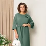 Эффектное платье из трикотажа средней плотности, полуприлегающего силуэта, с горловиной формы "лодочка" и карманами. Рукав спущенный, 7/8. Длина платья- 102 см по центру спинки.