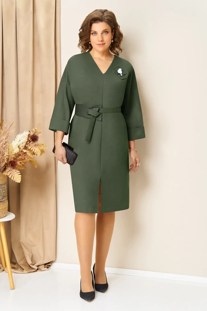 Элегантное лаконичное платье из эластичного трикотажа прямого полуприлегающего силуэта с акцентной V-образной горловиной. Центральный элемент отделки платья- вставки из кожи и необычная съемная брошь для легкости образа. Длина платья немного за колено, уместная в большинстве ситуаций. Спереди небольшой вырез для максимального удобства. Длина платья по центру спинки- 104см. Декоративный и функциональный пояс- в комплекте изделия.