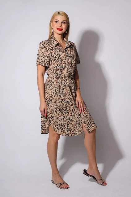Платье-рубашка прямого силуэта с кулиской по лини талии. Имеются неглубоки разрезы по бокам со скругленными линииямия. Рукав втачной, короткий. Воротник отложной. Платье застегивается на маленькие пуговки по всей длине по переду.