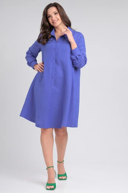 Платье женское свободного силуэта, расклешенное книзу. Горловина с отложным воротником рубашечного типа. Рукав втачной. По низу рукава манжета, застегивающаяся на пуговицы. Длина рукава 59 см для роста 164 см, 61 см для роста 170 см. Спереди на полочке планка с пуговицами и нагрудный карман-«рамочка». В боковых швах платья находятся карманы. Длина платья по спинке от плеча 96 см для роста 164 см, 100 см для роста 170 см.