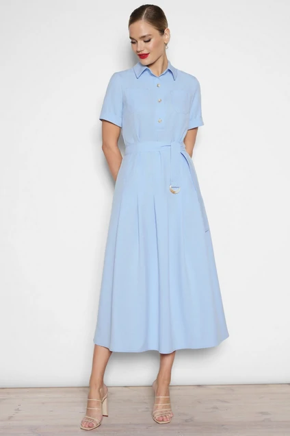 Летнее платье - это неизменный атрибут сезона отпусков, а так же жарких городских будней и романтических вечеров. Платье женское силуэта “песочные часы” из костюмно-плательной ткани, отрезное по линии талии, длиной миди. В комплект к платью идет съемный пояс.