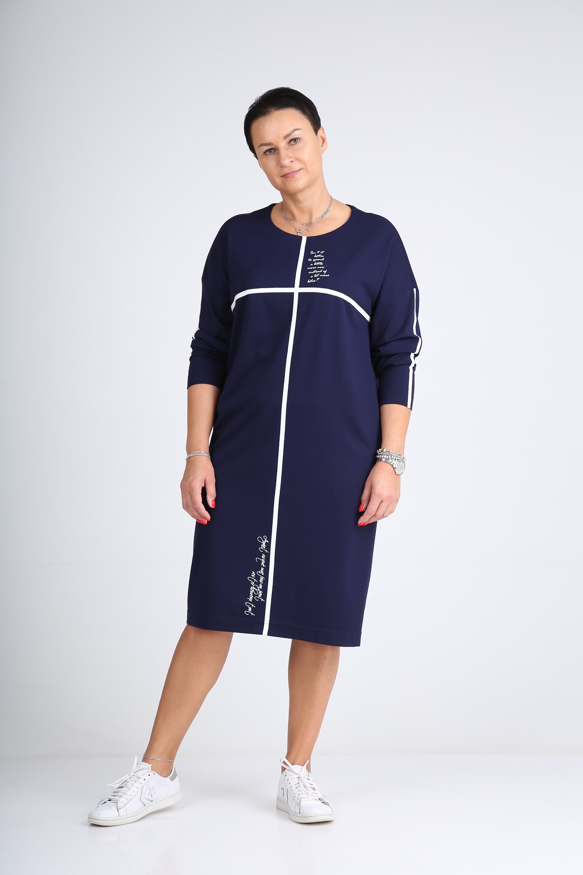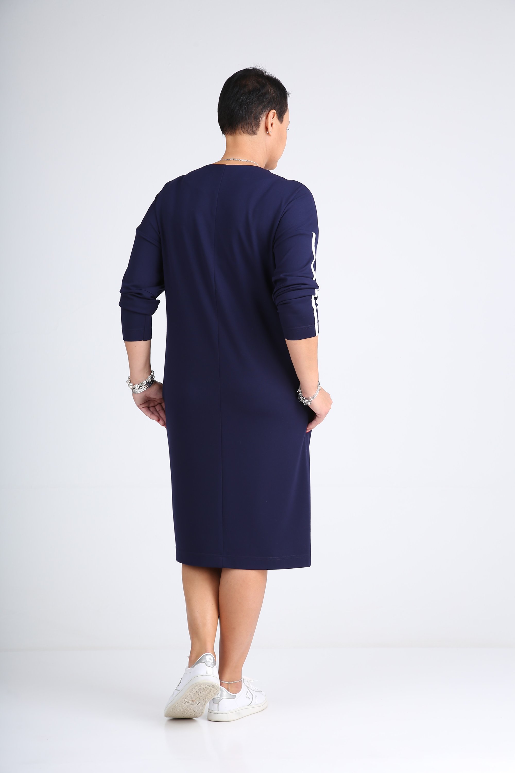 Платье прямого силуэта, зауженного к низу. Выполнено из мягкого триукотажного полотна. Плечо спущено, рукав втачной одношовный, длинный.В боковых швах, потайные карманы.Полочка и рвкава декорированы белой киперной лентой и наклейками - печатями. Горловина круглая, обработана обтачкой. Них платья и рукавов обработаны. Длина изделия по спинке 104 см. Длина рукавов 44 см.