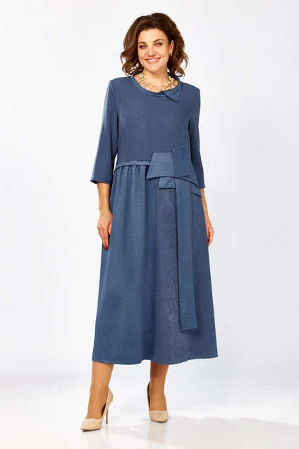 Нарядное платье изготовлено из двух видов ткани-бархатистой и блестящей текстурированной в красивом серенево-голубом оттенке.Полуприлегащий силуэт с отрезной, слегка завышенной, талией. Нижняя часть платья А-силуэта с одной стороны по линии талии со сбокой. Рукав 3/4, втачной. Вырез горловины округлой формы со стойкой и фантазийным воротником. Особенностью этой модели, которая предает образу торжественность, являются геометричные детали настроченные на пояс спереди и сзади по спинке и символизирующие нарядный королевский бант. Платье идеально подойдет на любое торжество-юбилей,свадьбу и многие другие мероприятия. Длина изделия по среднему шву спинки 128 см.