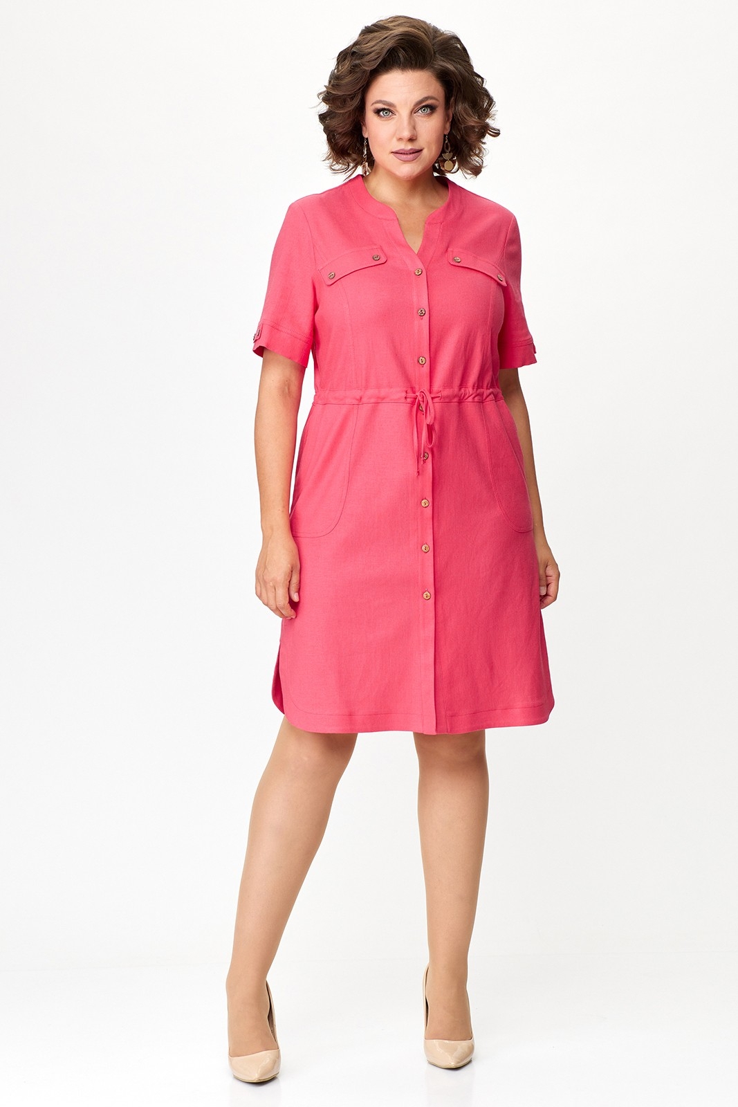 Женское летнее платье прямого силуэта из льняной ткани. Вырез горловины фигурный V-образный. Рукав короткий с манжетой и декоративными элементами. Застежка на пуговицах. По талии кулиска со шнуром. По бокам закругленные разрезы. Спереди снизу накладные карманы и декоративные карманы на груди. По спинке кокетка с бантовой складкой.