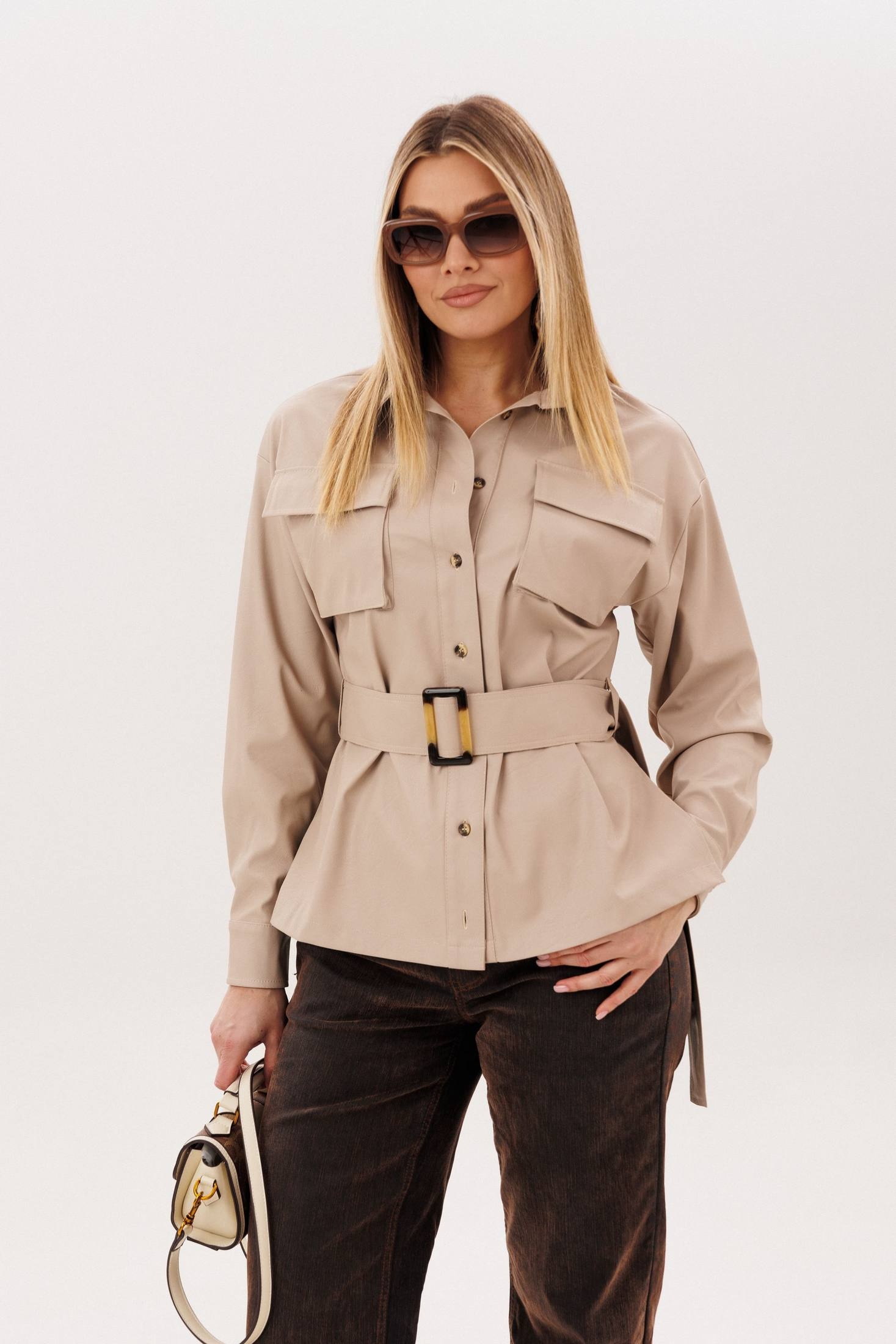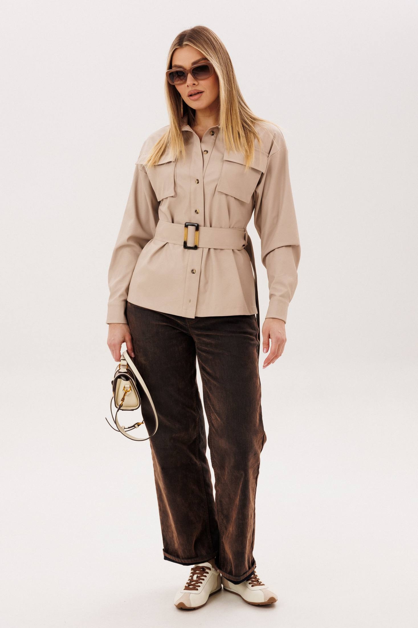 Рубашка 1826 саванна скин Anelli сочетает в себе стиль и комфорт. Коллекция бренда Анелли предлагает уникальный дизайн, выполненный из мягкой эко-кожи, которая сохраняет форму и обеспечивает удобство в повседневной носке. Свободный крой и отложной воротник на стойке создают элегантный образ, дополненный застежкой на пуговицах и двумя накладными карманами с клапанами. Пояс из той же эко-кожи позволяет варьировать силуэт рубашки, подчеркивая талию или оставляя её свободной. Бежевый цвет и детали, такие как боковые разрезы, делают её идеальным выбором для осеннего гардероба, подходящим для работы или прогулок. Длинные рукава на манжетах добавляют классической нотки, а универсальность модели позволяет сочетаться с различными стилями.