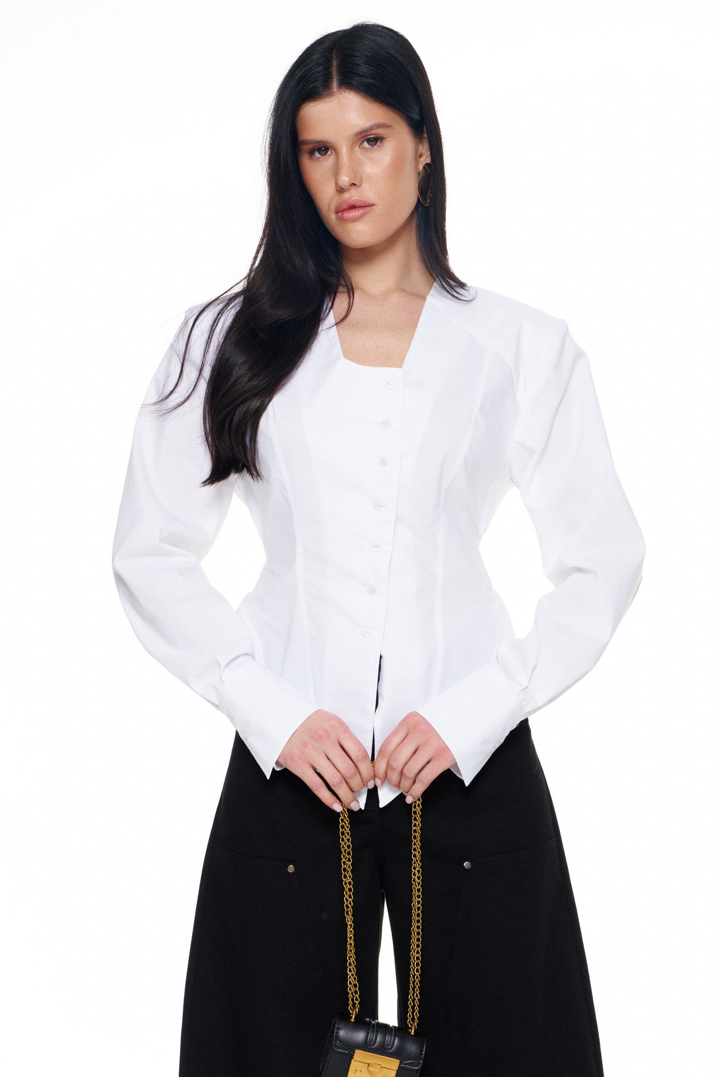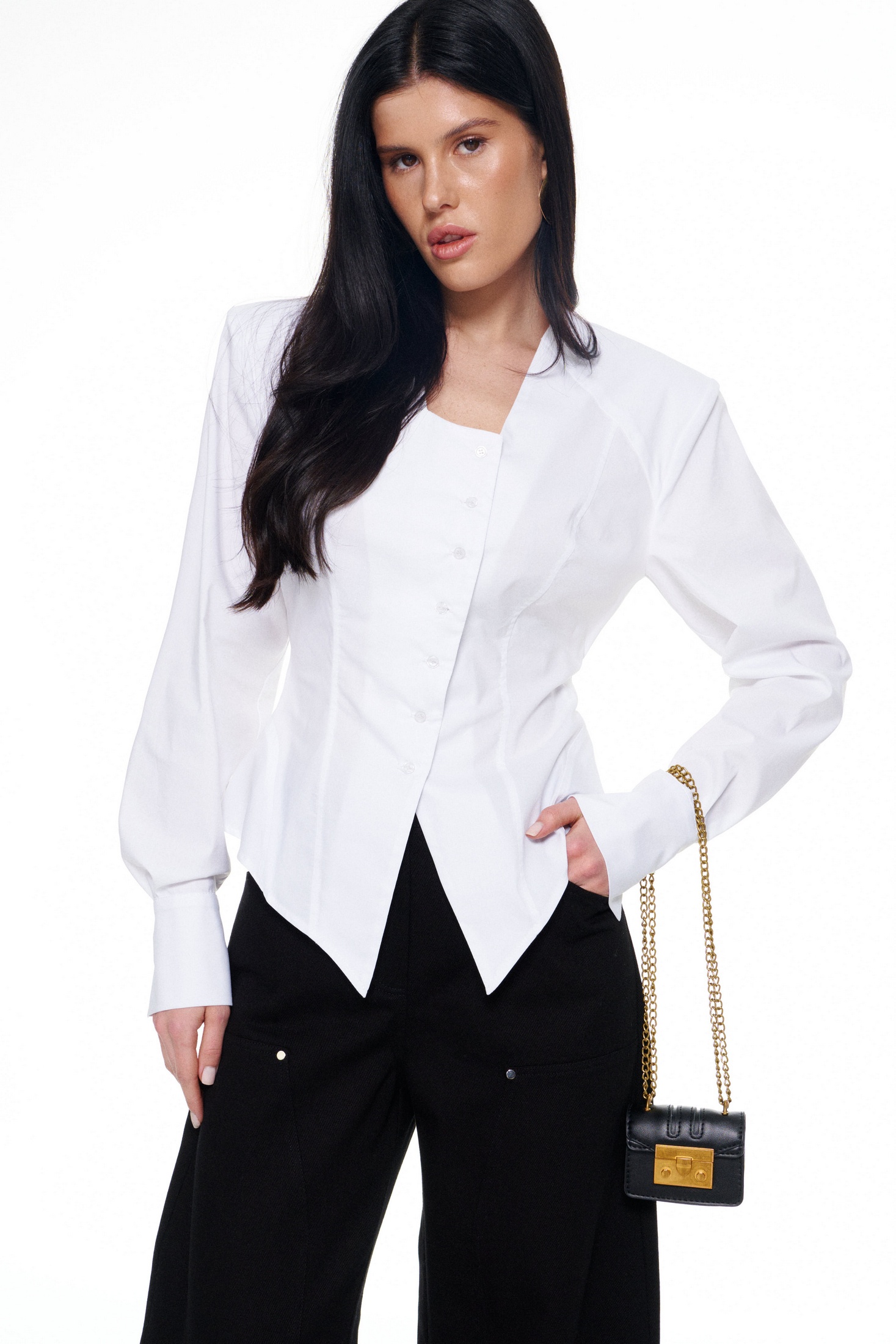 Рубашка 4026 белый KaVari сочетает в себе стиль и комфорт. Коллекция бренда KaVari предлагает идеальное решение для офисного и повседневного гардероба. Изготовлена из хлопка с добавлением полиэстера и эластана, эта рубашка обеспечивает комфорт и свободу движений. Приталенный силуэт с эффектом баски и объемные плечи создают выразительную форму, подчеркивая женственность. Длинные рукава на манжетах и глубокий вырез горловины со смещённой застёжкой на пуговицы добавляют элегантности. Боковые завязки позволяют регулировать посадку и создавать игривый акцент с бантом на спине. Белый цвет и расклешённый низ делают эту рубашку идеальной для весенне-летнего сезона. Длина изделия по середине спинки: 42-44р - 57см; 46-48р - 58см. Длина рукава: 42-44р - 63см. 46-48р - 64см.
