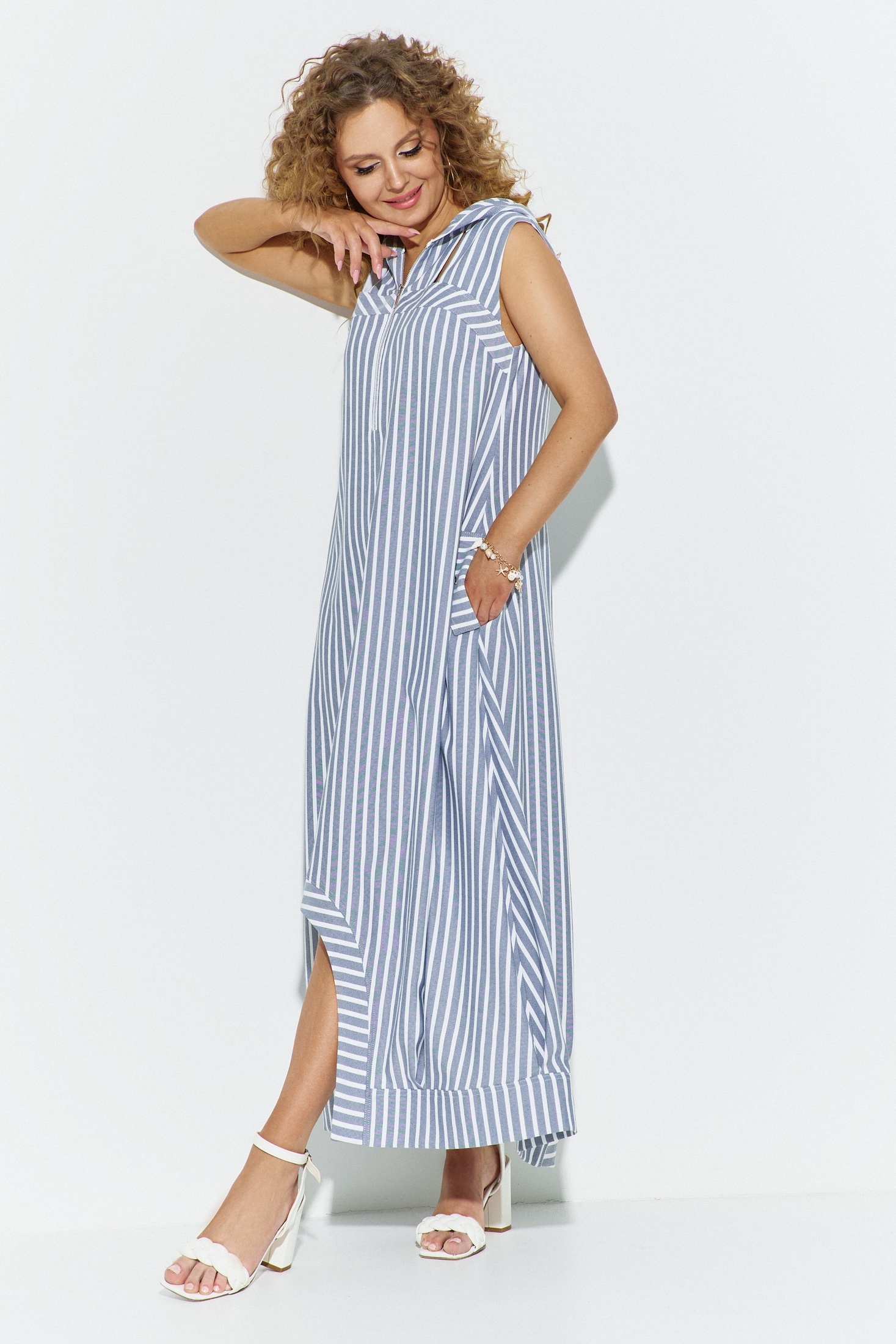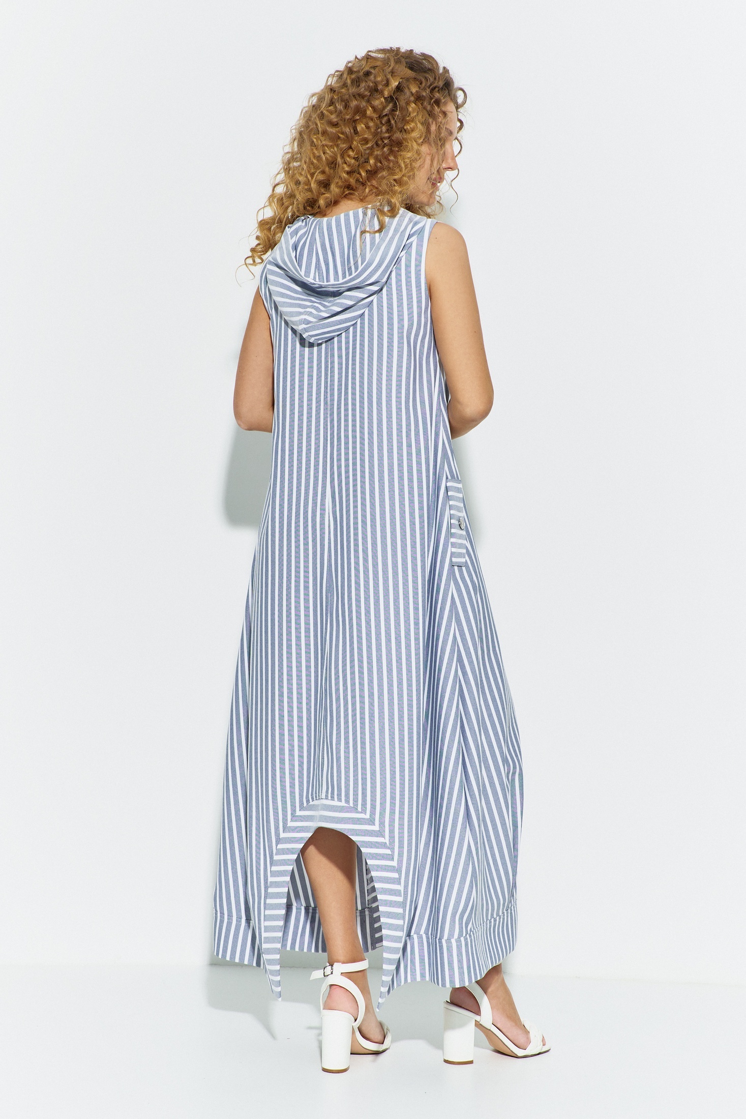 Сарафан женский выполнен из ткани лен-вишер. По полочке выполнены декоративные разрезы. Центр переда разрезной с функционально молнией по горловине. В боковых швах карманы декорированные клапанами. Низ изделия фигурный. Спинка разрезная, Изделие с капюшоном. Длина изделия по центру спинки 102 см, длина изделия по боку от плеча 131 см