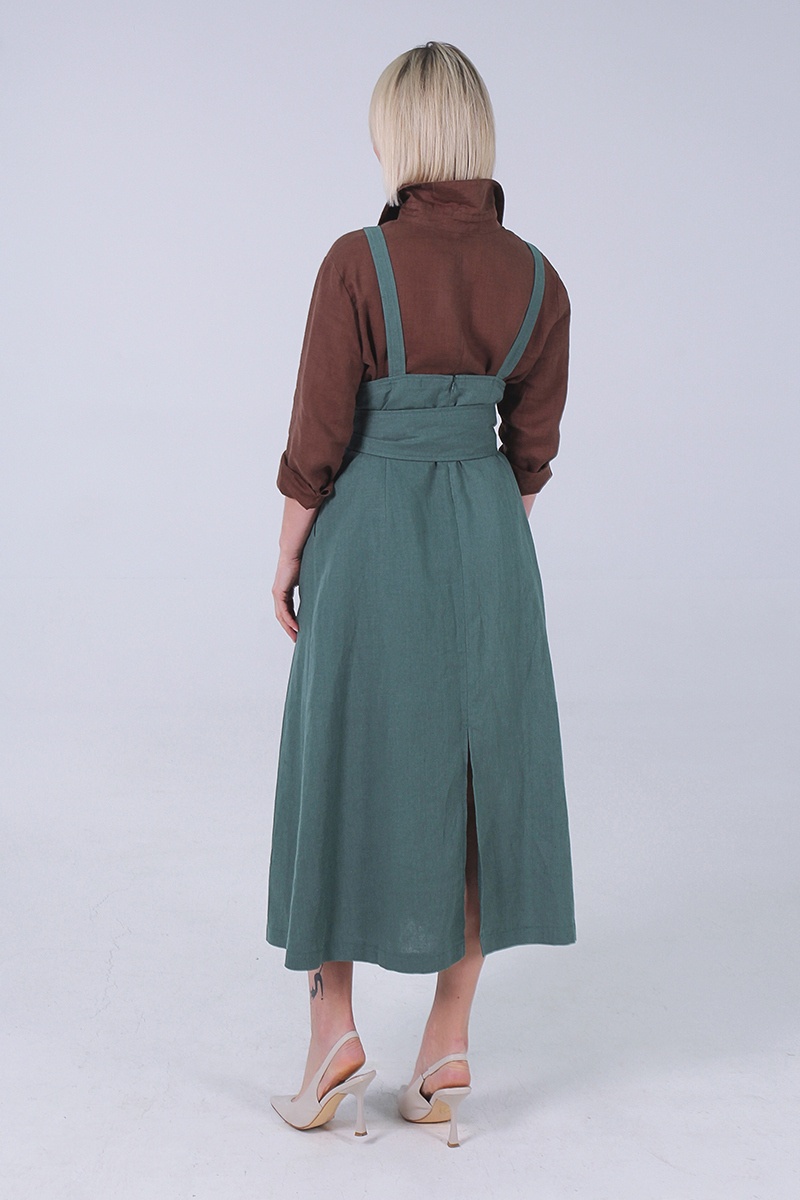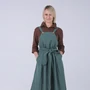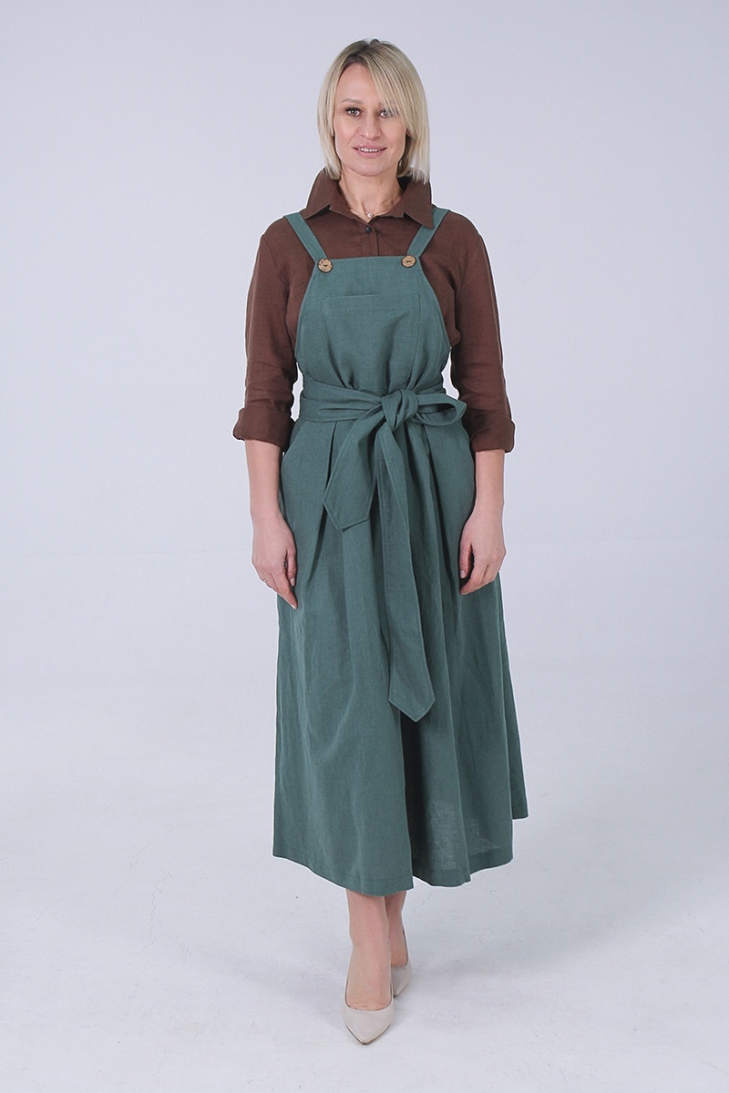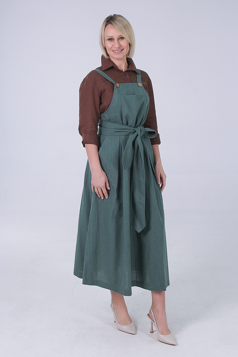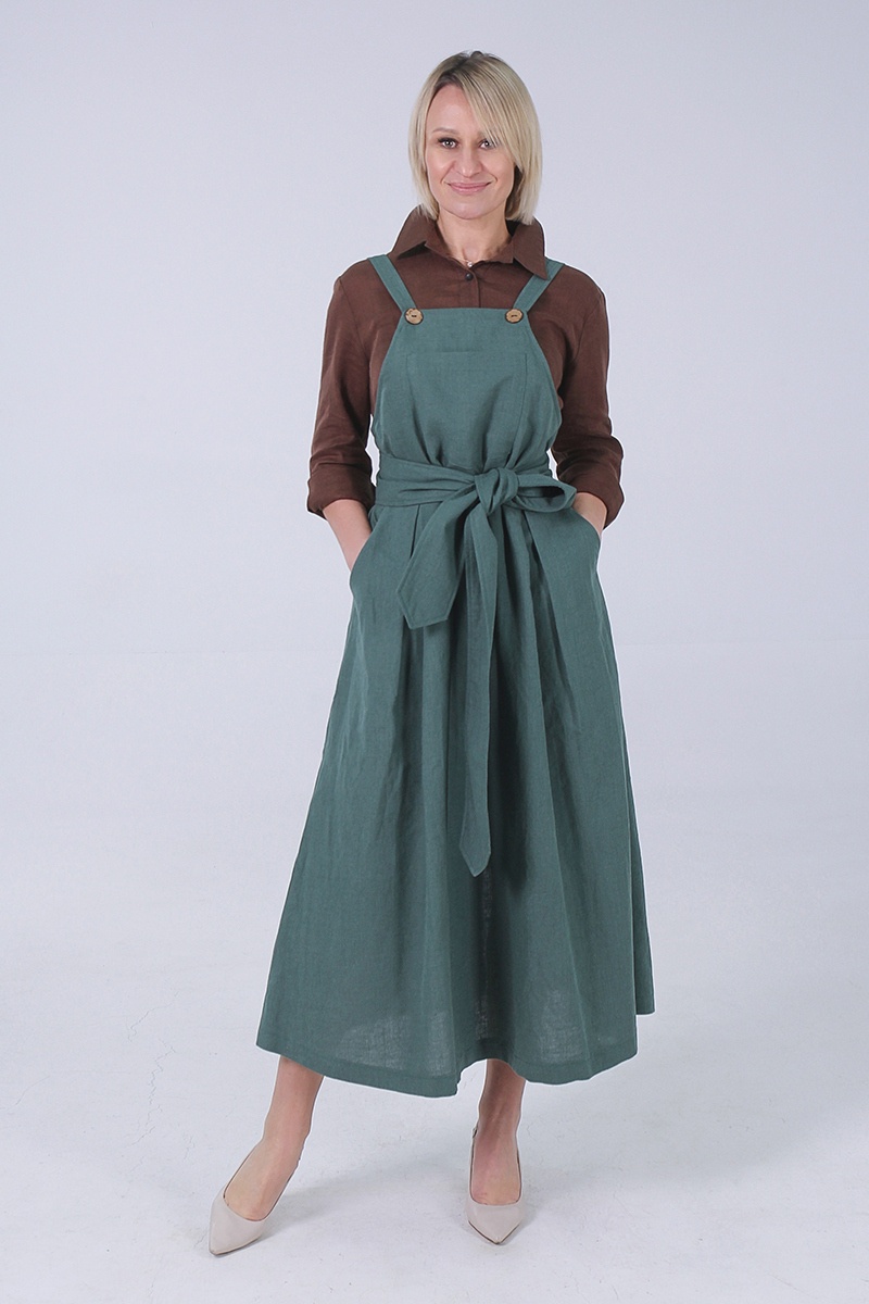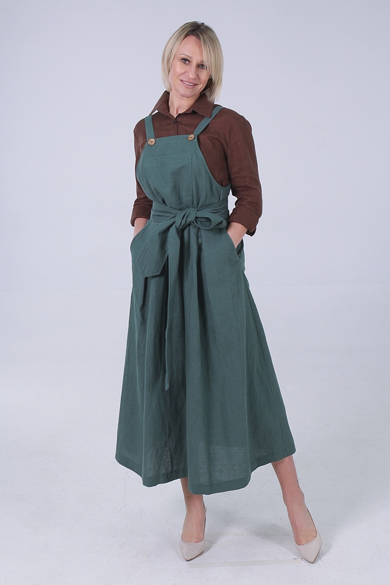Сарафан выполнен из 100% качественного умягченного льна. В осенне-весенний период сарафан отлично сочетается с водолазкой и рубашкой, летом можно сочетать с топом, или футболкой. Сарафан застегивается на пуговицы, на спинке молния, в комплекте широкий пояс. Создает свободный, лёгкий силуэт. Отличная качественная вещь в вашем гардеробе.