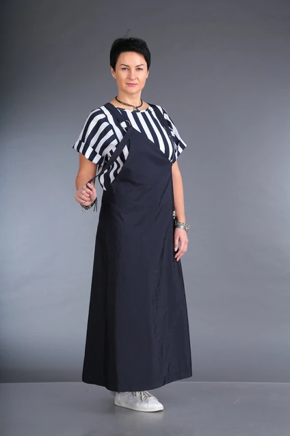 Комплект женский - блуза и сарафан. Блуза выполнена из ткани небольшой растяжимости. Длина по спинке 55 см, длина рукава от горловины 36 см. Сарафан выполнен из тонкой плащевой ткани на вискозной основе с легким крэшем. Длина по боковому шву 90 см.