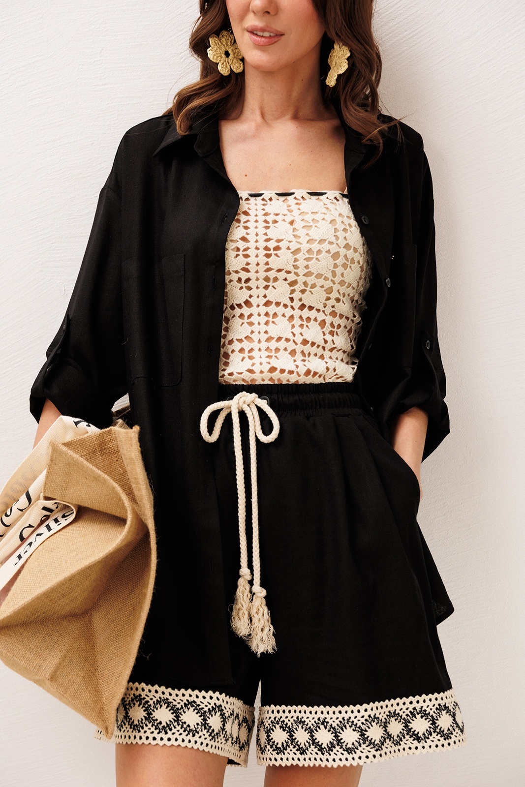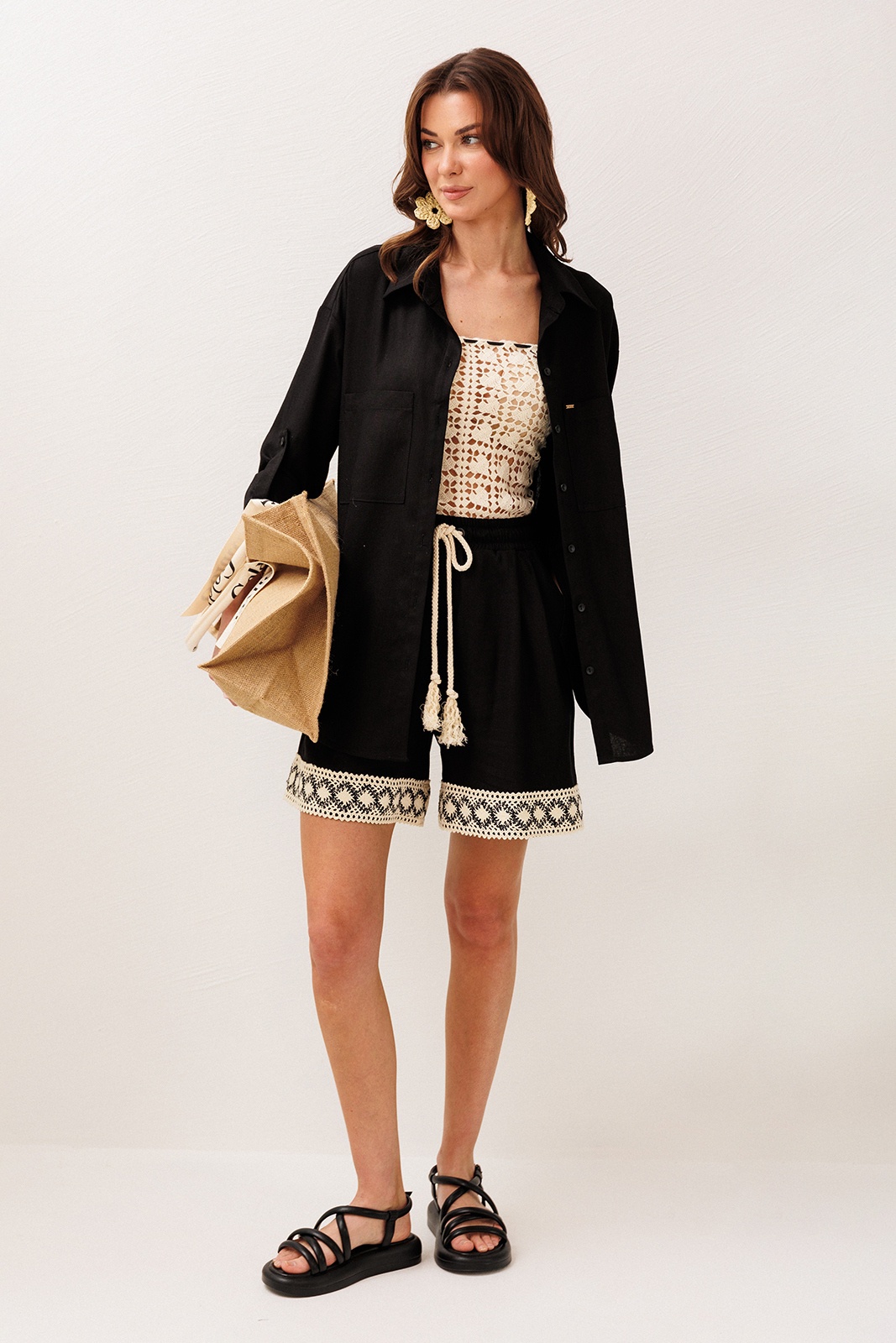 Шорты на притачном отстроченном поясе со втянутым декоративным шнурком. По переду со складками, от притачного пояса и карманами в боковых швах с наклонным входом. По низу шорт притачено кружево.