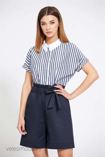 Шорты выполнены х/б ткани, расширены к низу, на манжетах. Талия завышена. Карманы в боковых швах. Пояс на резинке, в качестве отделки завязывающийся сбоку бант.