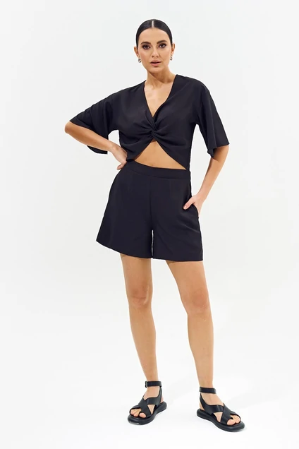 Базовые женские шорты полуприлегающего силуэта с завышенной линией талии выполнены из легкой струящейся ткани. По переду функциональные карманы, притачной пояс по спинке полностью на резинке для лучшего прилегания.