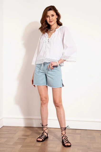 Стильные джинсовые шорты, слегка расклешенные, на притачном поясе с застежкой на молнию и пуговицу, с боковыми джинсовыми карманами спереди, с фигурной кокеткой и накладными карманами сзади.