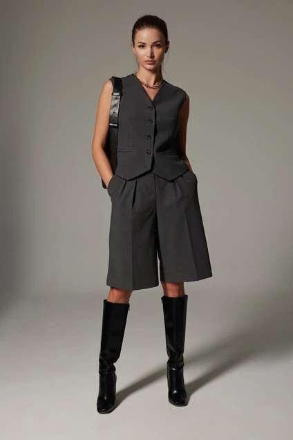 Шорты-бермуды - яркий хит этого сезона! Они идеально подходят как для повседневных прогулок, так и лояльно впишутся в офисный дресс-код. Шорты-бермуды свободного, прямого силуэта. На передних половинках заутюжены стрелки, переходящие в складки по линии талии. Застежка-гульфик, по переду боковые наклонные карманы. Пояс стабильный по переду, по задней части шорт на резинке, с настроченными шлевками и застежкой на пуговичку. Чтобы получить максимум комфорта, можно включить в образ дополнительный слой - жилет или жакет ( н-р S-2317 ). Длина шорт по боковому шву с поясом 59 см. Ширина шорт по низу +-33 см. в полуобхвате.