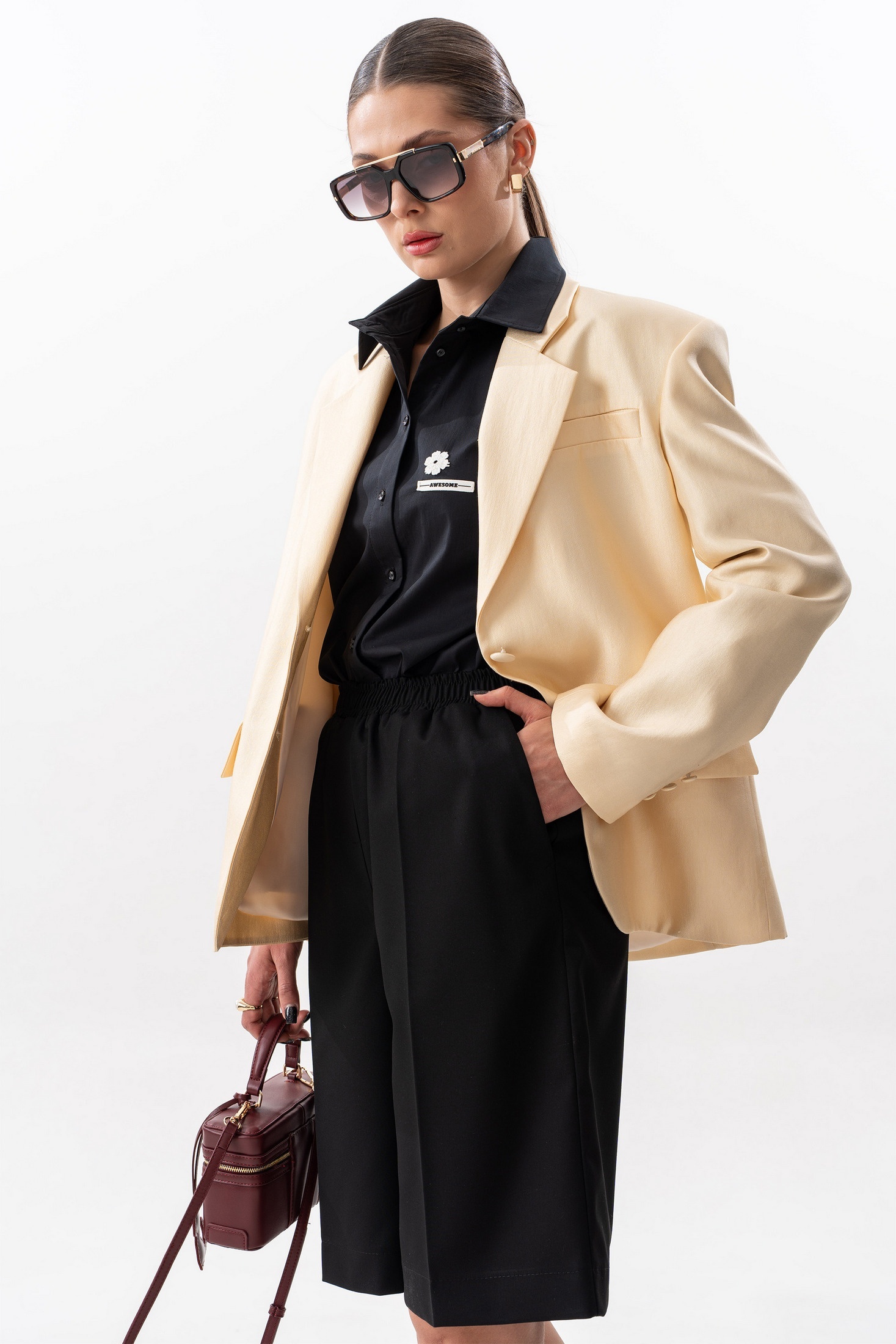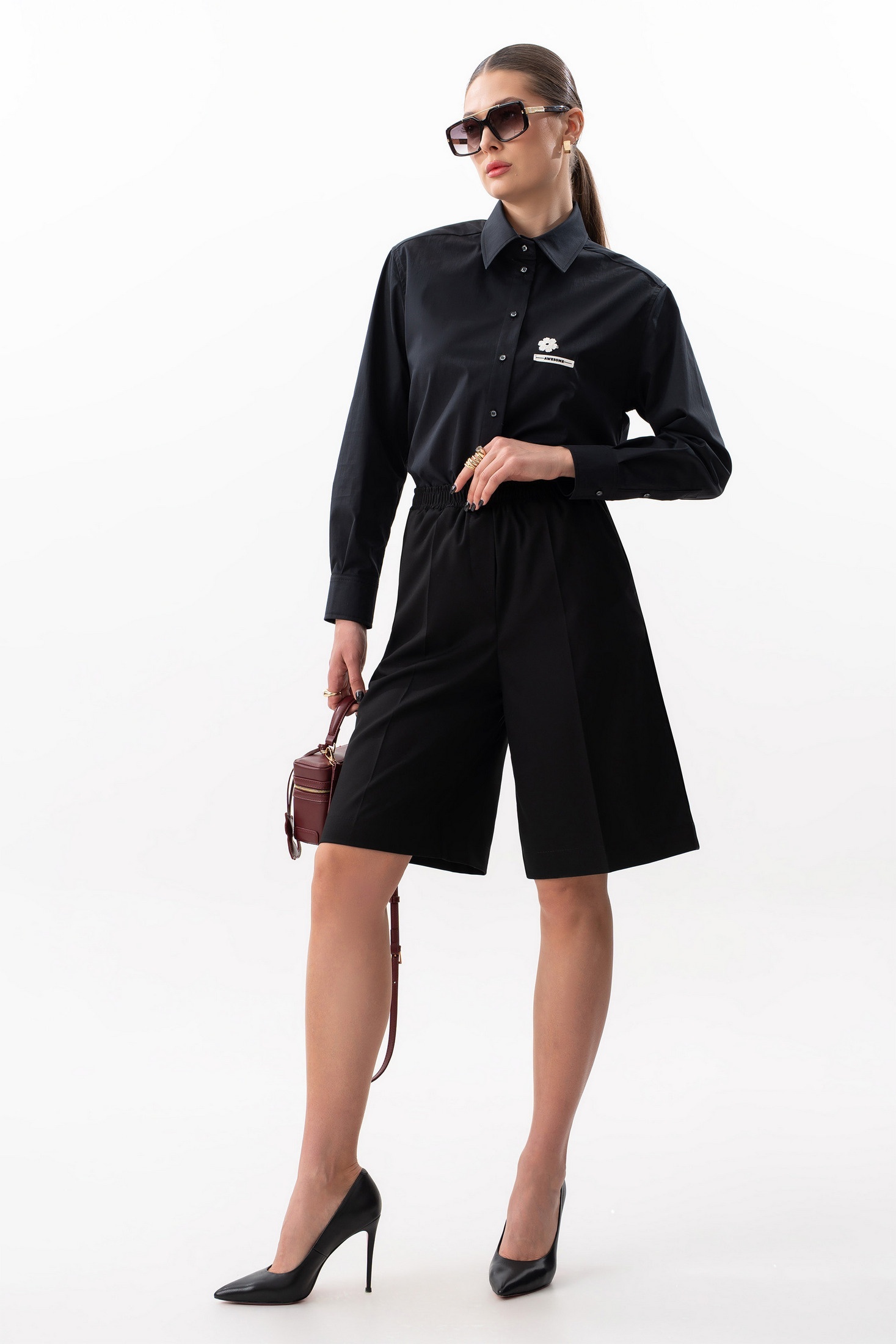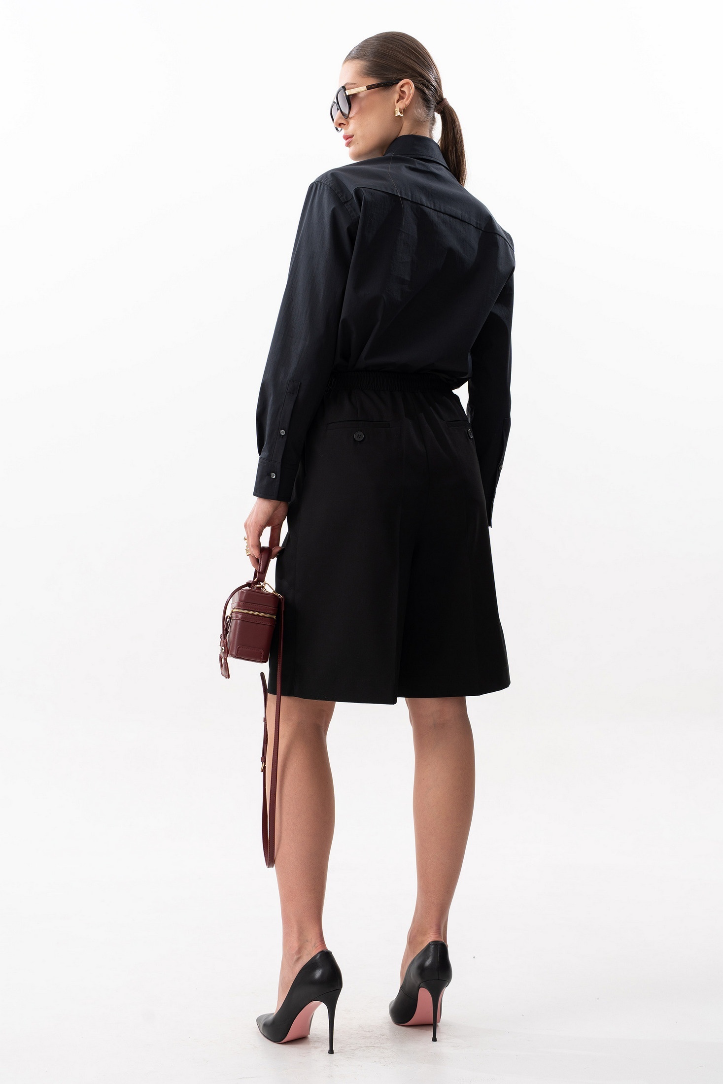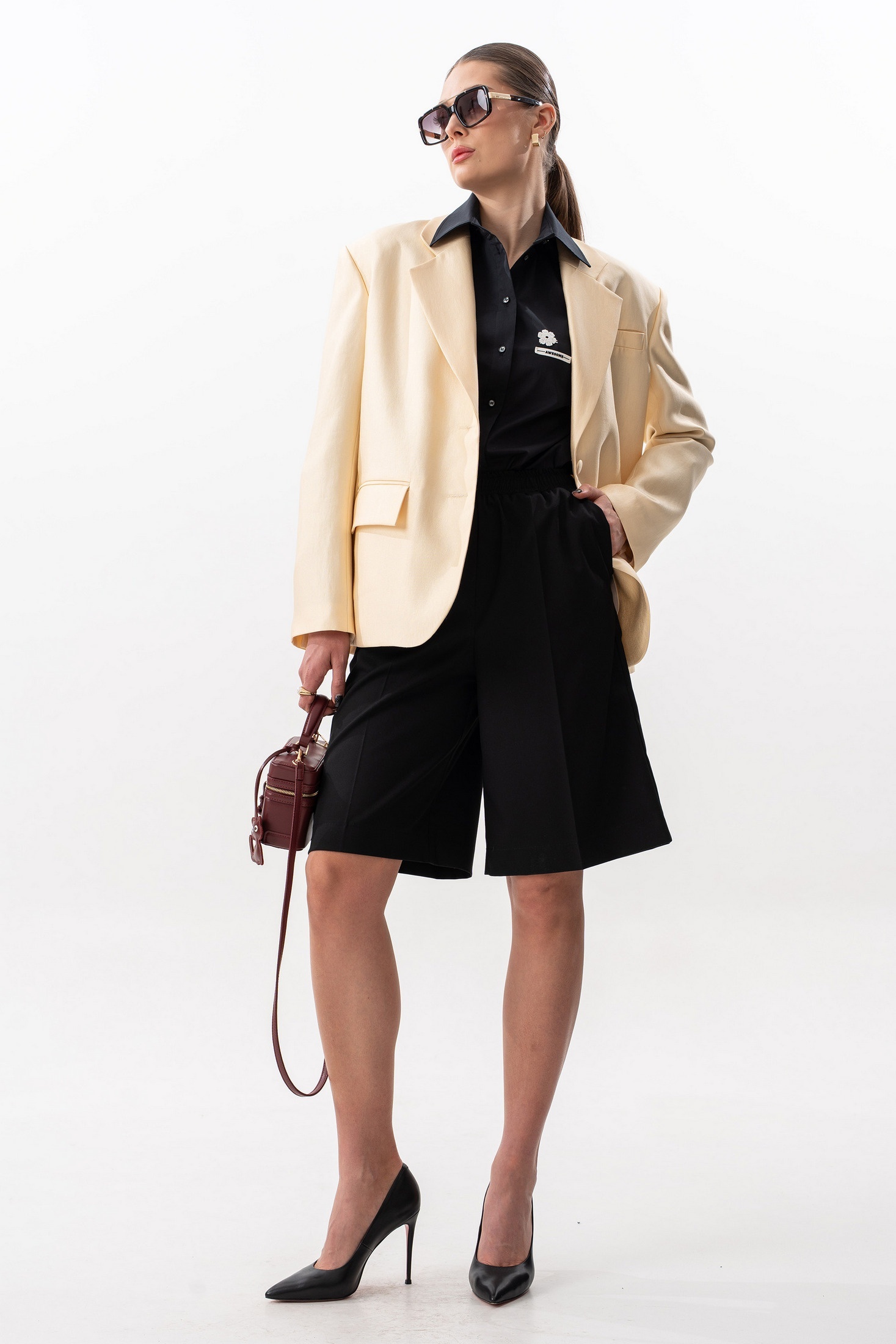 Шорты прямого свободного силуэта. Пояс на резинке, по переду боковые наклонные карманы. Задняя часть с внутренними карманами с листочкой. Длина шорт по боковому шву с поясом 59 см. Параметры брюк в готовом виде в 44 р.: обхват талии +-66 см (с резинкой ), обхват бедер 108 см. На фото: блузка S-7632, жакет S-2635