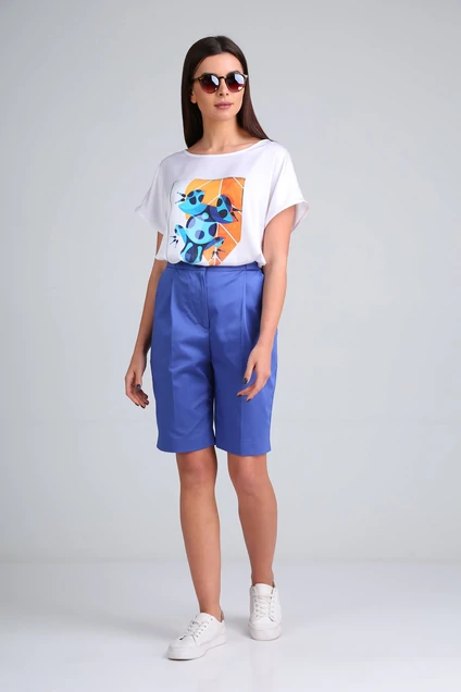 Шорты из хлопка-атласа, с карманами в боковых швах, складками на передних и вытачками на задних полотнищах, гульфиком и застежкой-«молнией», на поясе с застежкой на петли и пуговицы.