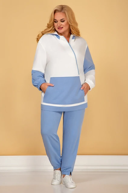 Комплект женский 2х предметный, состоящий из толстовки и брюк. Ткань трикотаж двухнитка , цвет молоко и небесно голубой. Толстовка прямого силуэта с манжетой по низу и на рукавах манжета на резинке.. По переду на искось застежка на "молнию".по переду функциональный карман-кенгуру застегиваются на декоративные пуговицы.. Горловина оформлена .Брюки – пояс с резинкой, и манжете резинке по низу брюк. Джемпер, длина по спинке 73 см. длина брюк 99 см.