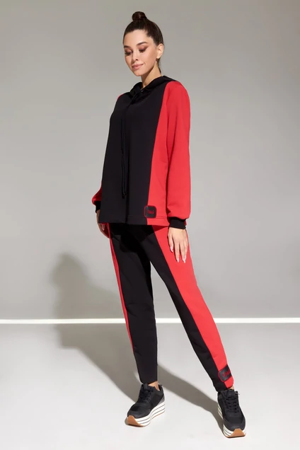 Комплект состоит из джемпера и брюк. Джемпер ибрюки комбинируются из разных цветов ткани. Центральная часть полочки, спинки и капюшон из одного цвета, бочки полочки, спинки и рукава из другого цвета. Капюшон на подкладке по краю втянут декоративный шнур. Рукава одношовные втачные на манжете из довяза. Передние изадние половинки брюк разрезаны вдоль на две части. Центральная деталь передних и задних половинок брюк из одного цвета, боковые детали из другого. По низу джемпера и брюк настрочена декоративная полоска из кожи. Длина джемпера 65 см, рукава 61 см, брюк - 100см.