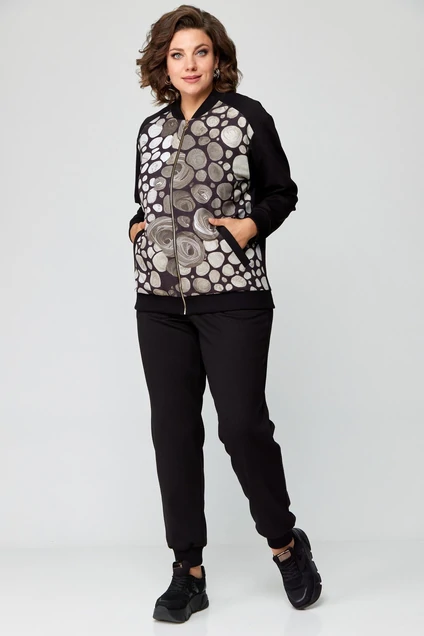 Костюм состоящий из бомбера и брюк выполнен из однотонного трикотажного полотна в сочетании с тканью с набивным рисунком.