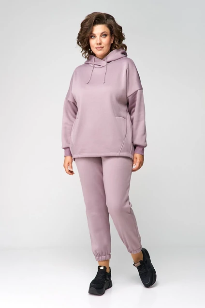 Костюм женский, состоящий из худи и брюк, выполнен из трикотажного полотна с изнаночной стороны на флисе. Худи свободного, обьемного силуэта. Полочка худи с подрезами, горловиной круглой формы с капюшоном. Верхняя часть спинки цельная, с переходящими боковыми швами на полочку. Нижняя часть спинки притачная, изогнутой формы, за счет чего образуется обьем. Рукав одношовный, длинный, на притачной манжете по низу.