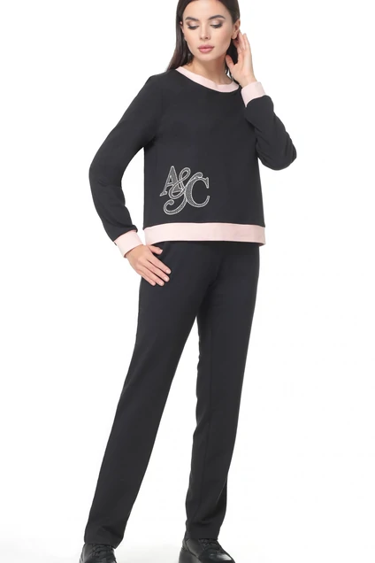 Ультра модный спортивный костюм из мягкой ткани 2-ух предметный. Джемпер: Свободного силуэта. По переду дизайнерская вышивка с логотипом фирмы. Спинка двойная, состоящая из 2-х частей. Нижняя часть спинки из прозрачной сетки. Верхняя часть из основной ткани. Спинка фиксируется на три завязки в виде бантов. Рукав длинный, втачной. По низу рукава притачная манжета. По низу изделия притачная манжета. По горловине притачная бейка. Брюки: Прямого силуэта. В подрезном бочке переднего полотнища карманы. По талии изделия пояс с эластичной тесьмой и шнуром.
