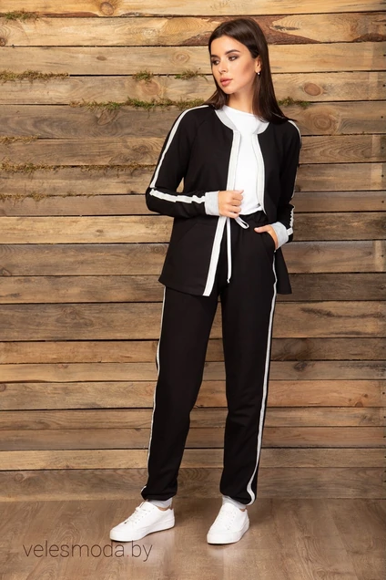 Костюм спортивный из мягкой ткани, состоящий из джемпера и брюк. Джемпер: Свободного силуэта. По переду нагрудные вытачки. По центру функциональная застежка молния и функциональные карманы. Рукав реглан, по низу рукава манжета. По центру рукава декоративная тесьма. По горловине изделия стойка. Брюки: Прямого силуэта. В подрезном бочке переднего полотнища карманы. Перед брюк с имитацией застежки. По боковым швам изделия декоративная тесьма. По талии изделия пояс со шнурком и эластичной тесьмой. По низу изделия притачная манжета. Модель подойдет на рост 164-170 см