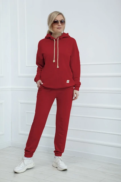 Комплект брючный женский, состоящий из джемпера и брюк из трикотажного полотна с хлопком. Джемпер свободного покроя, удлиненный до линии бедер на манжете по низу изделия, без застежки, с капюшоном, с рукавом на спущенной пройме и манжетами по низу рукавов. Брюки прямые на манжетах по низу брюк, на поясе с эластичной тесьмой и шнурком, с боковыми карманами на молниях по передним половинкам брюк.