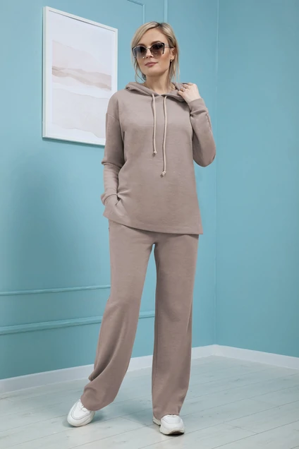 Джемпер свободного прямого покроя, удлиненный до линии бедер, с капюшоном, со спущенной проймой и длинным рукавом на манжете по низу рукава, по низу боковых швов-разрезы. Капюшон со шнурком. Брюки прямые свободные, на поясе с эластичной тесьмой, с боковыми карманами на молниях.