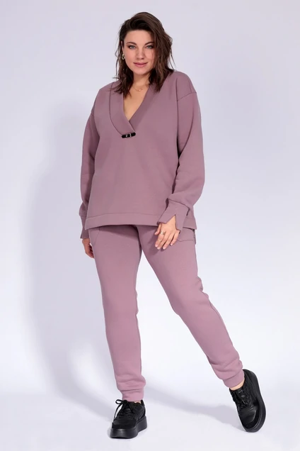 Комплект состоящий из стильного свитшота c V-образным вырезом и брюк-джогеров из 3-х нитки с начесом. Горловина обработана широкой обтачкой из основной ткани. По низу рукава широкая манжета из основной ткани с разрезом. Спинка длиннее переда - для вашего удобства и комфорта в носке. Свитшот дополнен боковыми разрезами с металическими золотистыми рамками на ленте. Стильные брюки джогеры свободного кроя, с высокой посадкой, широким поясом на резинке. Спереди имеются притачные карманы. Отрезная кокетка на задней части брюк делает их посадку идеальной. Манжеты брюк из основной ткани с эластичной резинкой. Длина по спинке: 62 см