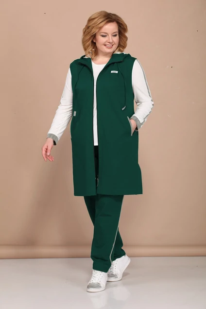 Стильный женский комплект состоит из жилета, брюк и блузы.