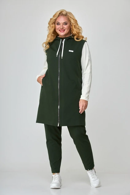 Жилет свободного силуэта, центральной застежкой на тесьму молния. По переду на уровне бедер прорезные карманы с листочкой, горловина оформлена капюшоном, по боковым швам разрезы. Жилет с капюшоном.