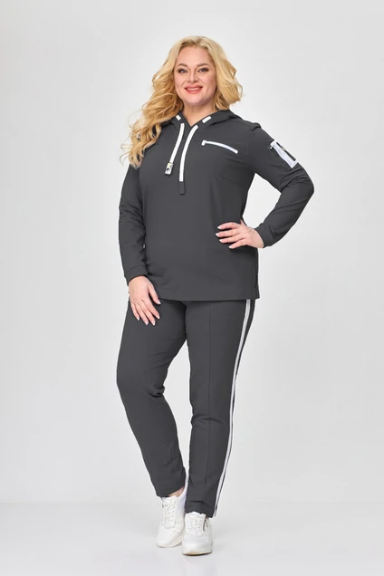 Стильный женский костюм выполнен в спортивном стиле из трикотажного полотна, состоит из блузона и брюк. Блузон полуприлегающего силуэта. По переду отрезная кокетка, горизонтальный подрез, в шве которого обработана декоративная молния в «рамку». Спинка с отрезной кокеткой, со средним швом. По боковым швам блузона разрезы, оформлены отделочными строчками. Рукава втачные, одношовные, по низу притачной манжет из основной ткани. На левом рукаве накладной карман с декоративной молнией и пришивной нашивкой. Горловина блузона оформлена капюшоном с декоративным шнуром и пришивной нашивкой.