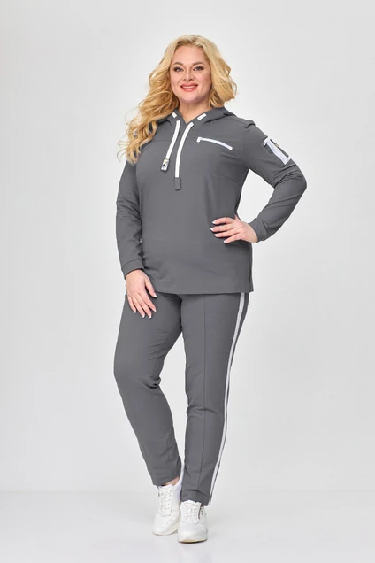 Стильный женский костюм выполнен в спортивном стиле из трикотажного полотна, состоит из блузона и брюк. Блузон полуприлегающего силуэта. По переду отрезная кокетка, горизонтальный подрез, в шве которого обработана декоративная молния в «рамку». Спинка с отрезной кокеткой, со средним швом. По боковым швам блузона разрезы, оформлены отделочными строчками. Рукава втачные, одношовные, по низу притачной манжет из основной ткани. На левом рукаве накладной карман с декоративной молнией и пришивной нашивкой. Горловина блузона оформлена капюшоном с декоративным шнуром и пришивной нашивкой.