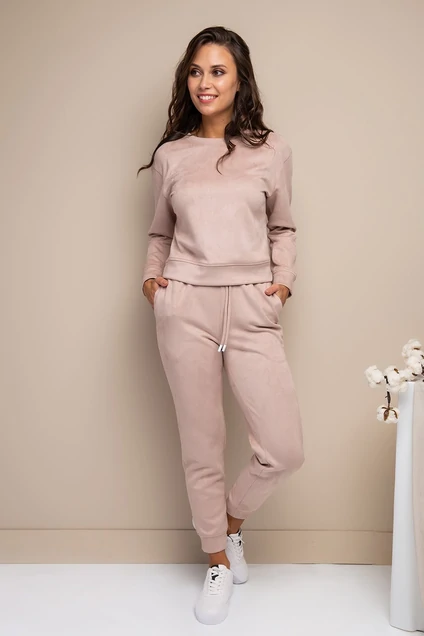 Брючный костюм в стиле casual из трикотажной экозамши. Свитшот прямого силуэта с притачным пояском по низу, линия плеча спущена, рукав длинный, на эластичной манжете. Брюки-джоггеры на широкой резинке по поясу с кулиской. Зауженный к низу силуэт фиксируется на эластичную манжету. В боковых швах джоггеров - карманы.