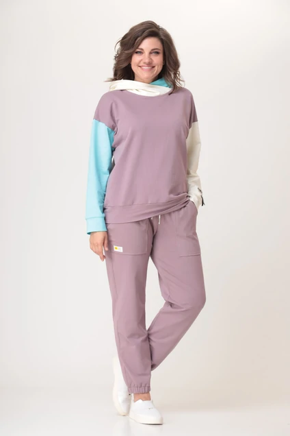 На передних половинах брюк расположены накладные карманы с наклонным входом. По низу брюки присборены на манжет с эластичной тесьмой-резинкой. Универсальный костюм в современном ритме.